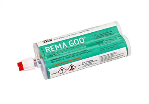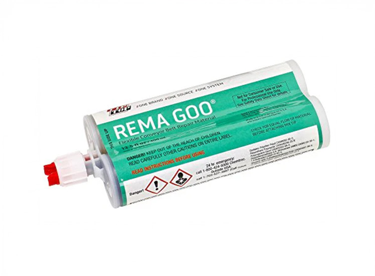 REMA GOO is designed to be a high performance conveyor belt repair product that allows you to fix your belt in less than an hour. (Note: repair times are dependent on cure temperatures.) Patented fast setting two-component polyurethane. It is packaged as 1:1 ratio liquids in a dual cartridge.