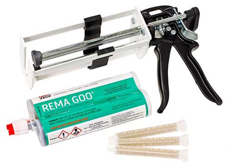 REMA GOO is designed to be a high performance conveyor belt repair product that allows you to fix your belt in less than an hour. (Note: repair times are dependent on cure temperatures.) Patented fast setting two-component polyurethane. It is packaged as 1:1 ratio liquids in a dual cartridge. Kit comes with Gun, extra tips and Rema Goo cartridge